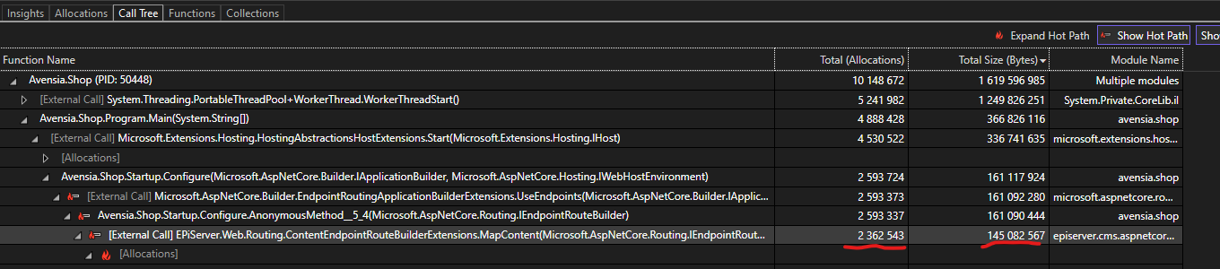 EPiServer.Web.Routing.ContentEndpointRouteBuilderExtensions.MapContent()In fact, 2.3M allocations (!), 145 MB of memory and this represent about 1/4 of the total memory allocated by the app during startup.