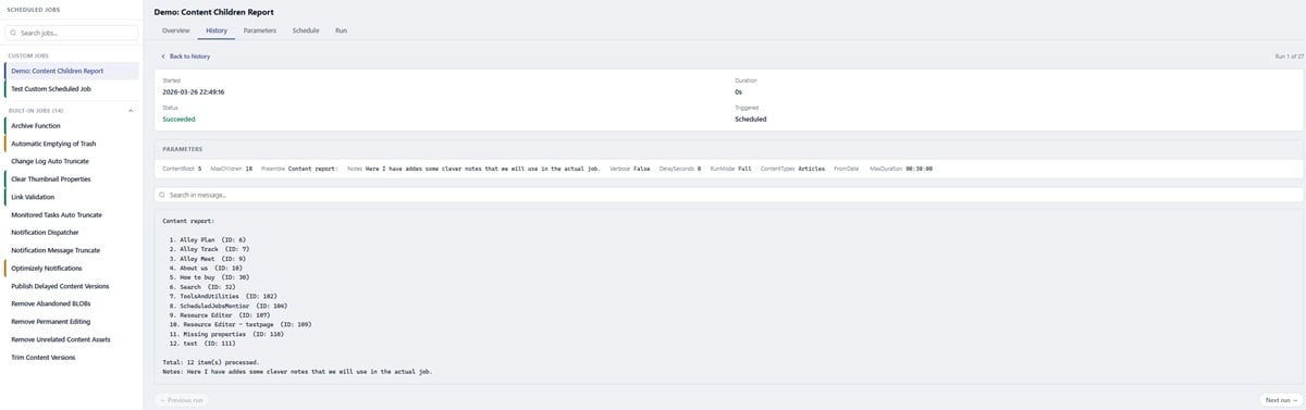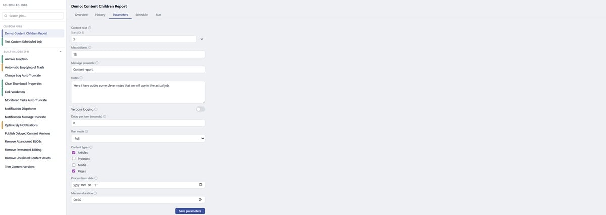 This is the feature I been wanting forever for my self but never took the time to build it until now. The built-in scheduled jobs admin has no concept of job parameters — you either hardcode values in the job or manage your own settings page somewhere. With this tool you can declare a typed parameters class, decorate it with a couple of attributes, and the tool renders a form for it automatically.