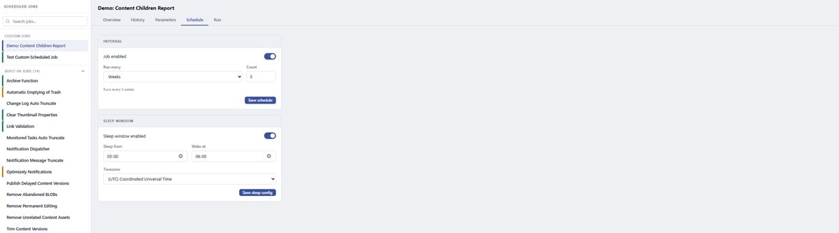 The Schedule tab lets you enable or disable a job and change its run interval without going through the built-in admin. It also exposes the sleep window configuration (see below).