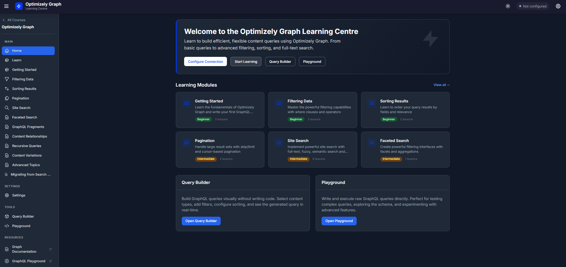 Every lesson includes interactive examples. When learning about Optimizely Graph, you don't just read about queries — you write and run them. There's a built-in playground where you can experiment, make mistakes, and see results instantly.