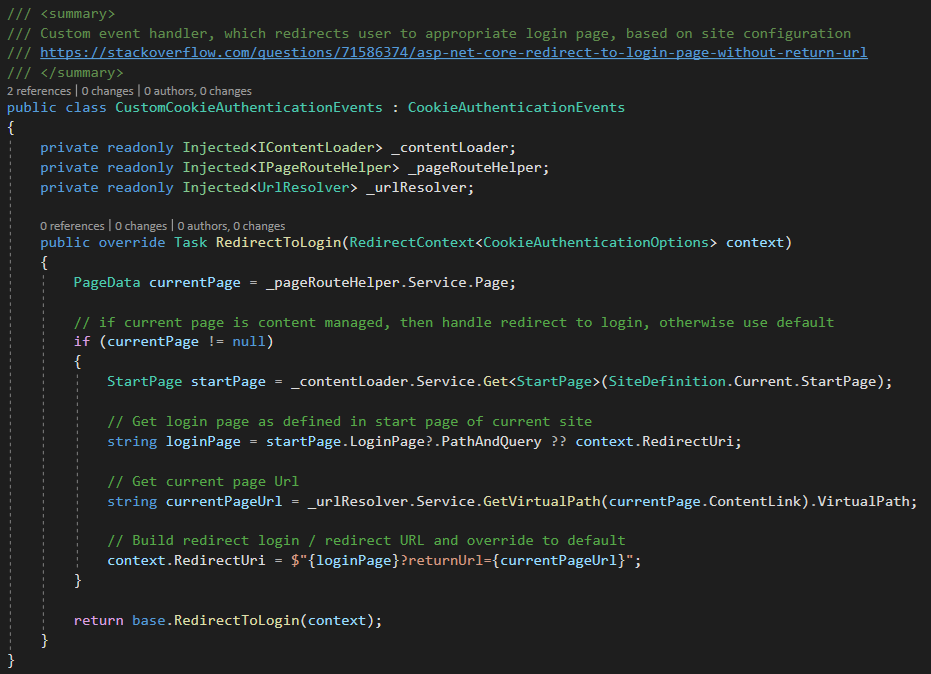 IPageRouteHelper is a great helper to quickly find the current page regardless of the context. As we are using Dependency Injection in our project, it is recommended to use a constructor parameter to inject a dependency. As it was possible when inheriting from AuthorizeContentAttribute we had to settle for the property injection using Injected<>.