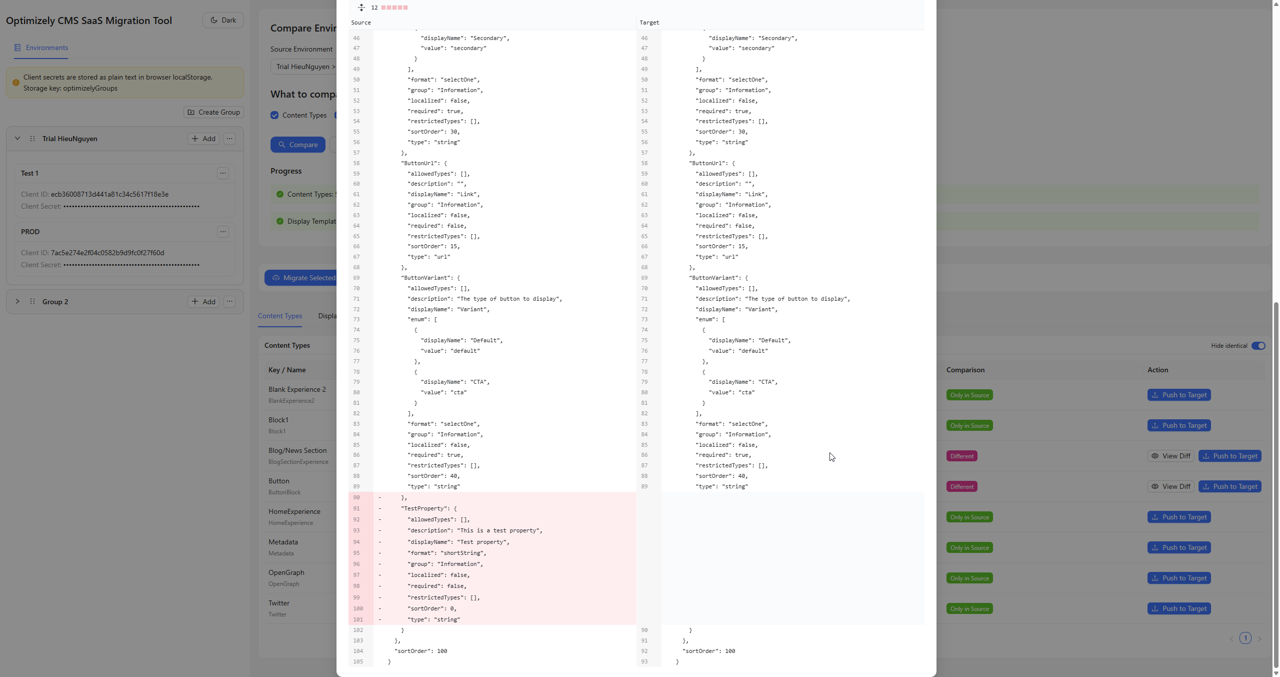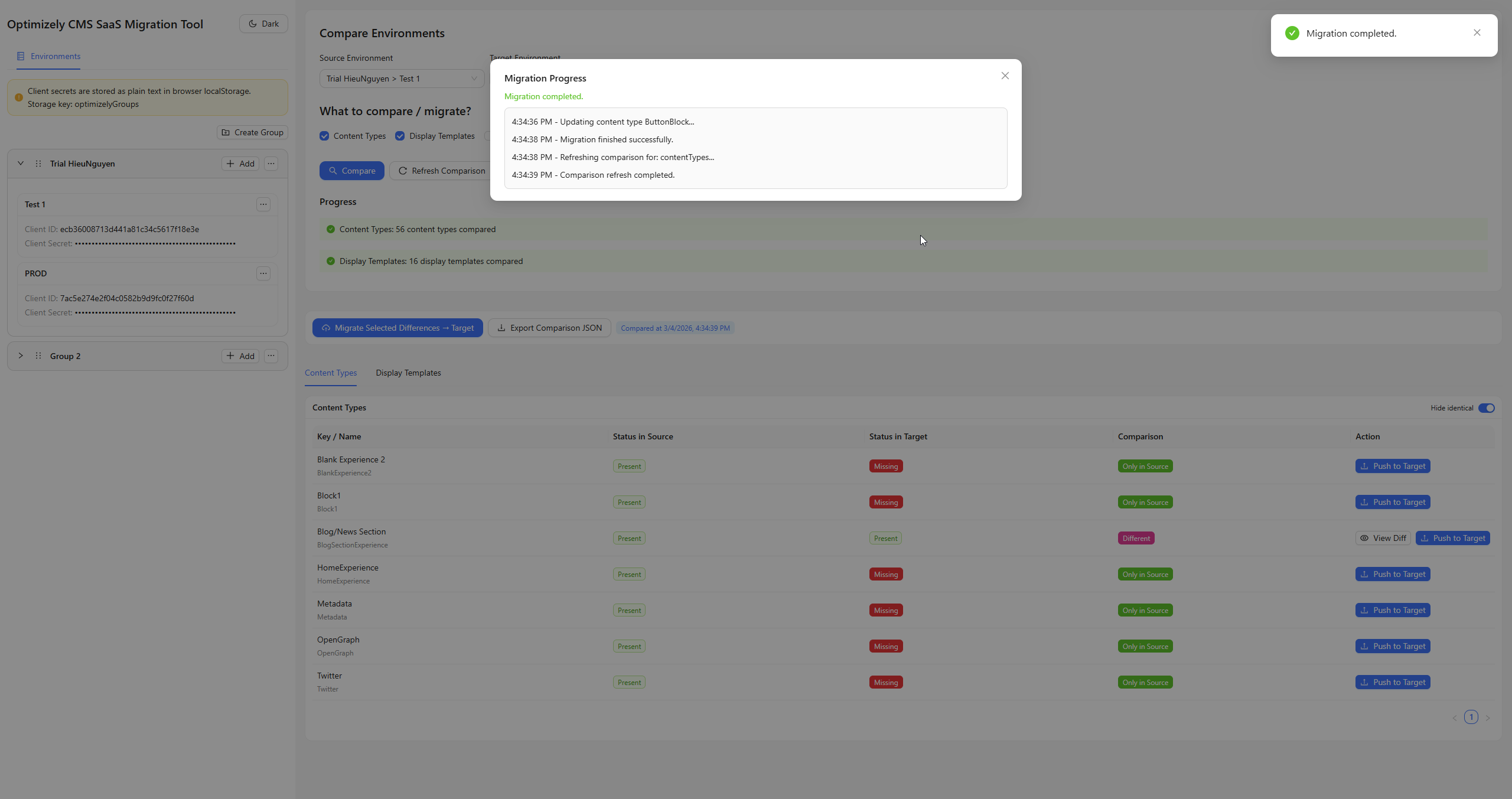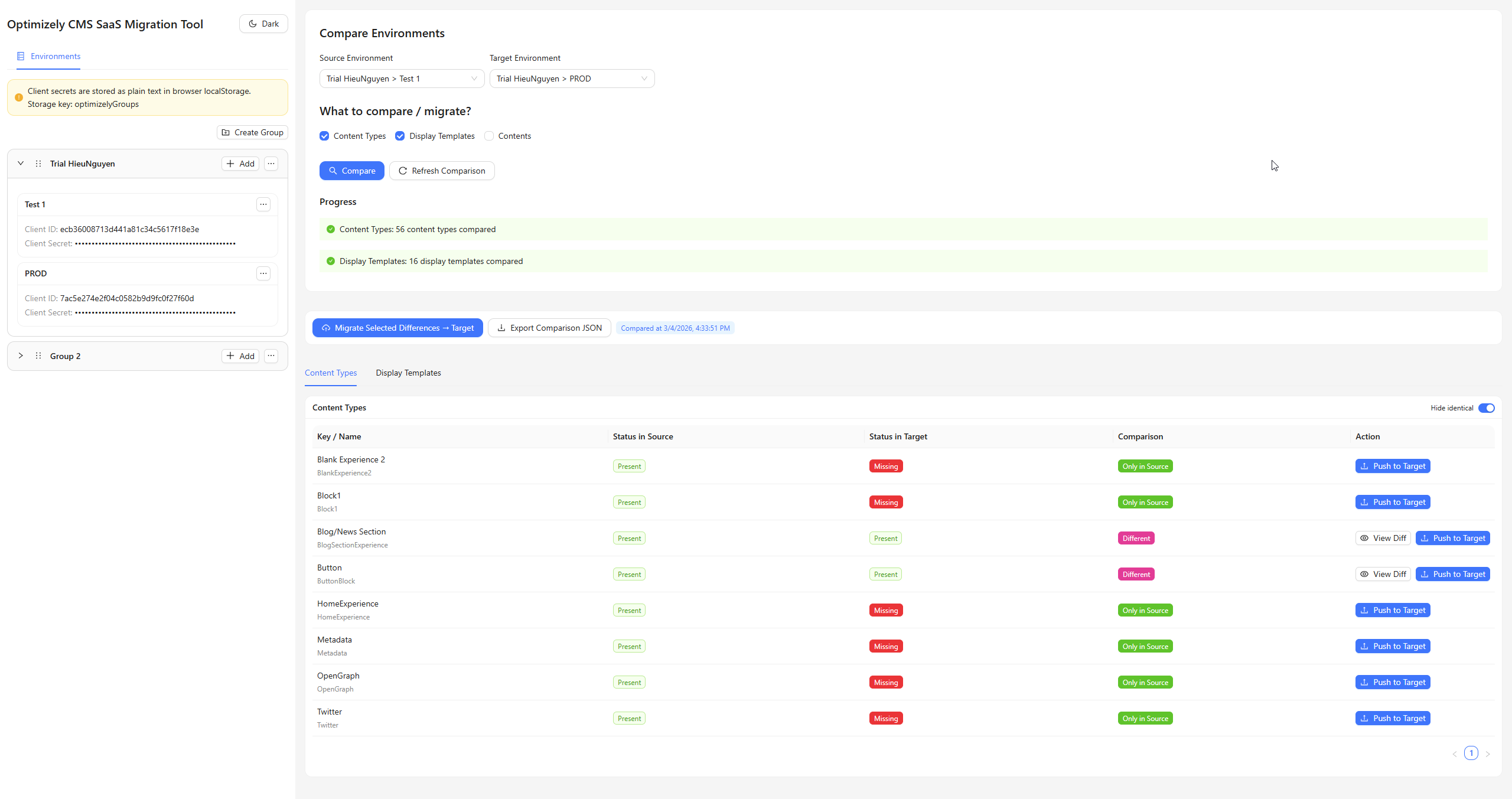 The Optimizely CMS SaaS Migration Tool addresses this gap by providing a lightweight, browser-based interface for comparing and migrating CMS SaaS entities.