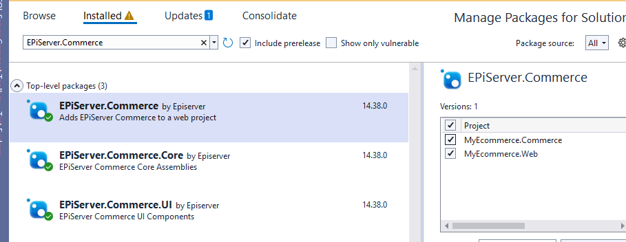 Now you a have a project to handle CMS "MyEcommerce.Web" and another to handle Commerce "MyEcommerce.Commerce" both in the same solution.