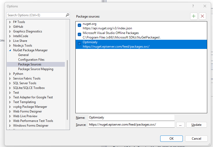 dotnet tool install EPiServer.Net.Cli --global --add-source https://nuget.optimizely.com/feed/packages.svc - Add Nuget source "https://api.nuget.optimizely.com/v3/index.json" in Visual Studio > Tools > Options > NuGet Package Manager > Package Sources. Note: For some reason, Optimizely’s documentation doesn’t clearly state that this step is necessary (at least at the time of writing). However, if you skip it, you won’t be able to manage NuGet packages correctly. The only place that mentions it still refers to the old source "https://nuget.episerver.com/feed/packages.svc/", both sources work