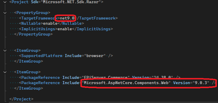 Check that both project "MyEcommerce.Commerce" have the same .Net version as "MyEcommerce.Web", For example, in the image bellow I have to change the target framework from net9.0 to net8.0 and update Microsoft.AspNetCore.Components.Web package from 9.0.3 to 8.0.16
