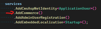 Go to "MyEcommerce.Web" project and open Startup.cs, replace the call to ".AddCms()" with ".AddCommerce()" (this method internally implements AddCms())