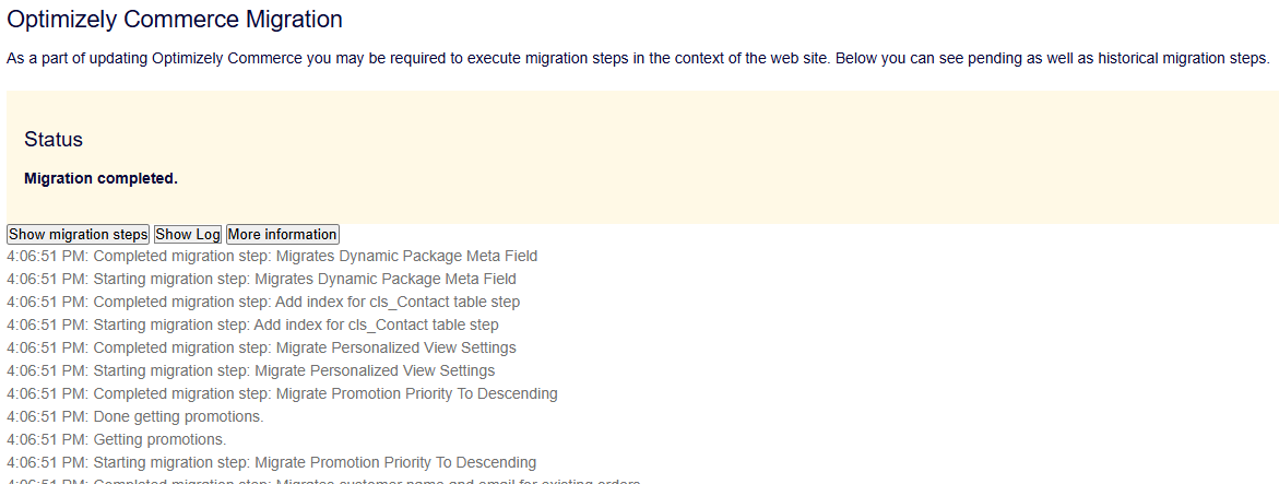 However, for some reason Optimizely is redirecting to the wrong url, so if you take a look in detail you will see that EPiServer/Commerce is twice, to fix this change the url to https://localhost:5000/EPiServer/Commerce/Migrate?autoMigrate=true , you should then see this migration page: