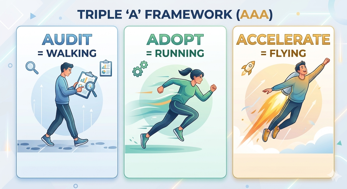 At Niteco, we saw this gap firsthand. After listening to our clients, we recognised that businesses were struggling to know where and how to start. So we built our own strategic AAA framework, structured around three phases: Audit, Adopt and Accelerate.