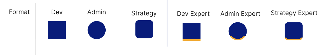 Expert-level certifications come with a yellow dash at the bottom of the icon, shaped to match the frame — a subtle but powerful marker of advanced expertise.