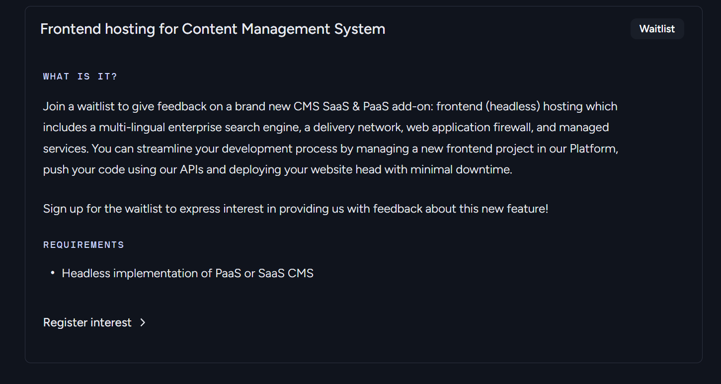 Just announced on the DXP, we FINALLY have a front end hosting solution coming as part of the DXP for modern decoupled solutions in both the PaaS and SaaS space