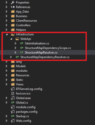 After installing EPiServer.ContentDeliveryApi, download the Infrastructure folder and replace the files in your solution with the downloaded files: SiteInitialization.cs, StructureMapDependencyScope.cs, StructureMapResolver.cs, and StructureMapDependencyResolver.cs.