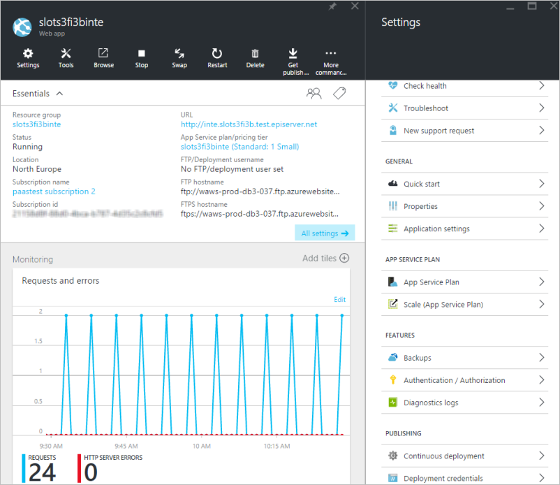 Contact Optimizely to get access to your DXP-specific resources in the Azure portal, so that you can monitor and troubleshoot your solutions. When logged in, the Azure portal will display information as in the example below.