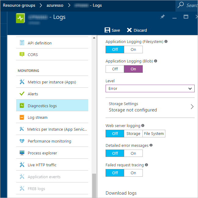 - Set the Application Logging (Blob) to On, select desired Level of verbosity, and select a storage account and container under Storage Settings.
