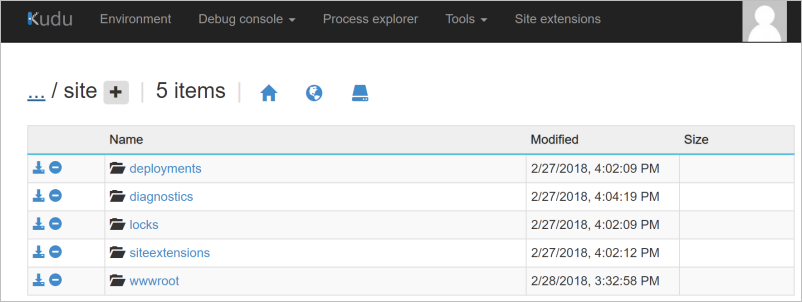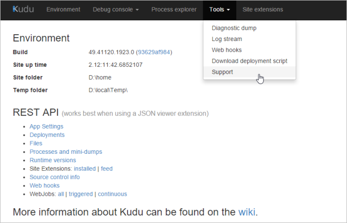 To access the service tool, you add an "scm" segment to the environment site URL, for example https://epvscms3p60ginte.scm.azurewebsites.net/