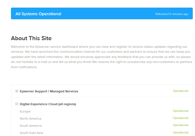 Visit the Microsoft Azure Status dashboard for general service operation information. See the Optimizely service dashboard for Optimizely-specific operational status.