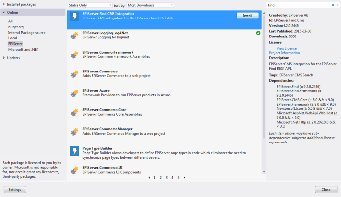 - Locate the EPiServer.Find.Cms package and click Install.