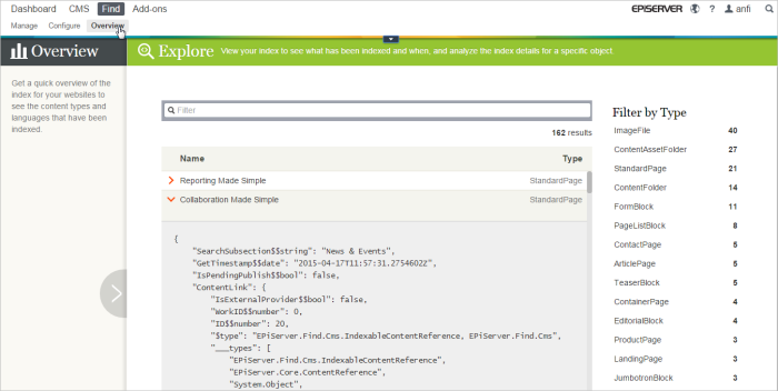 - Log in to the CMS edit view, go to Find > Overview > Explore to view the index. For the sample site, you see something like this: