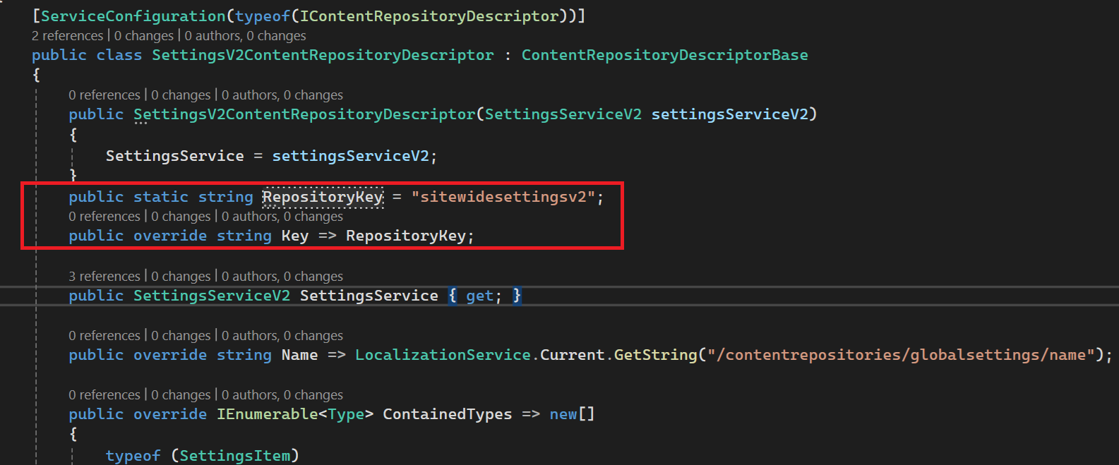 The repositoryKey value is "sitewidesettingsv2" which comes from a descriptor that implements ContentRepositoryDescriptorBase and is decorated with      [ServiceConfiguration(typeof(IContentRepositoryDescriptor))]
